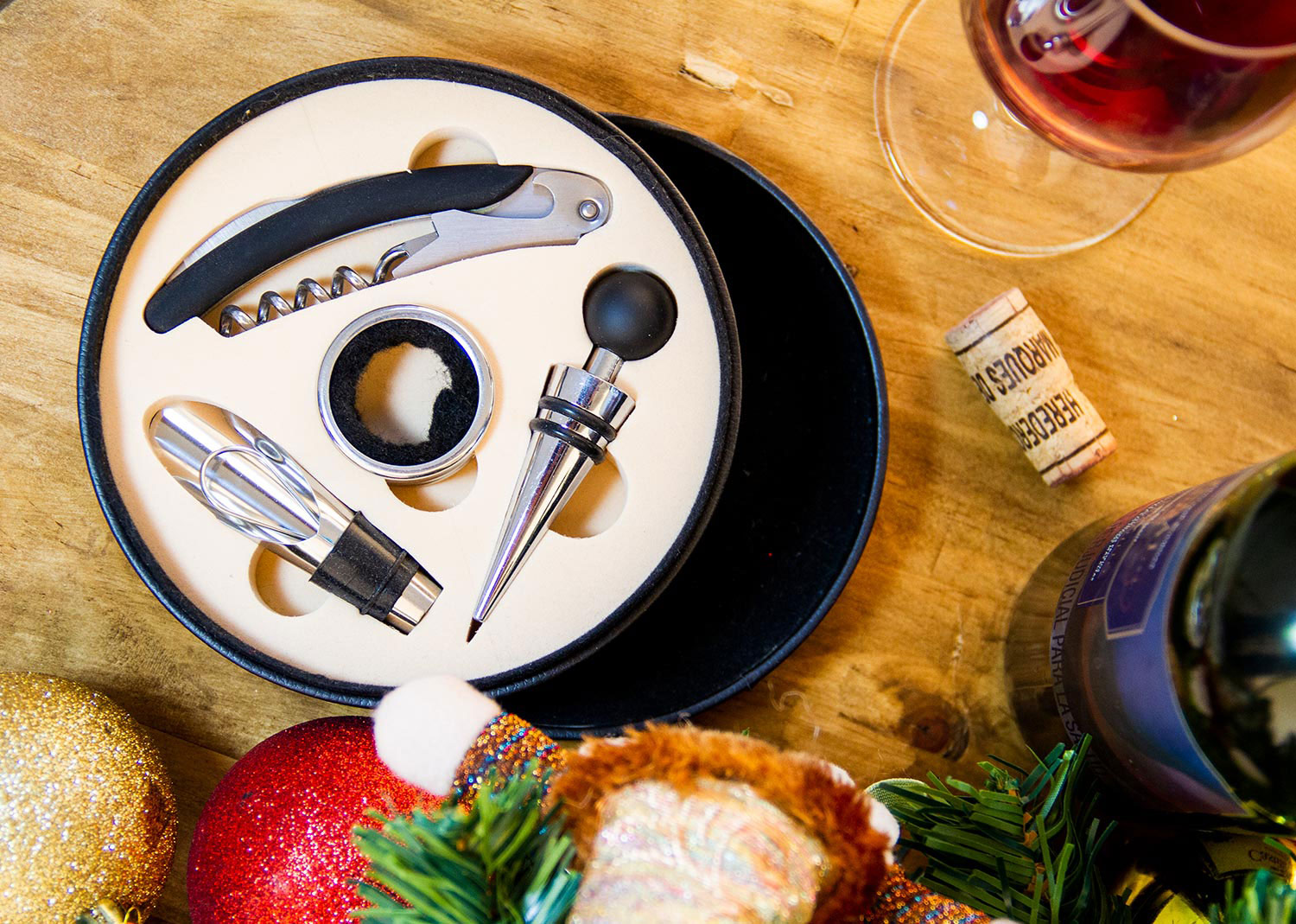 Contiene 4 accesorios de bar: Tapón para botella, cortagotas, aro antigoteo, sacacorchos de 1 tiempo. Caja interior beige.