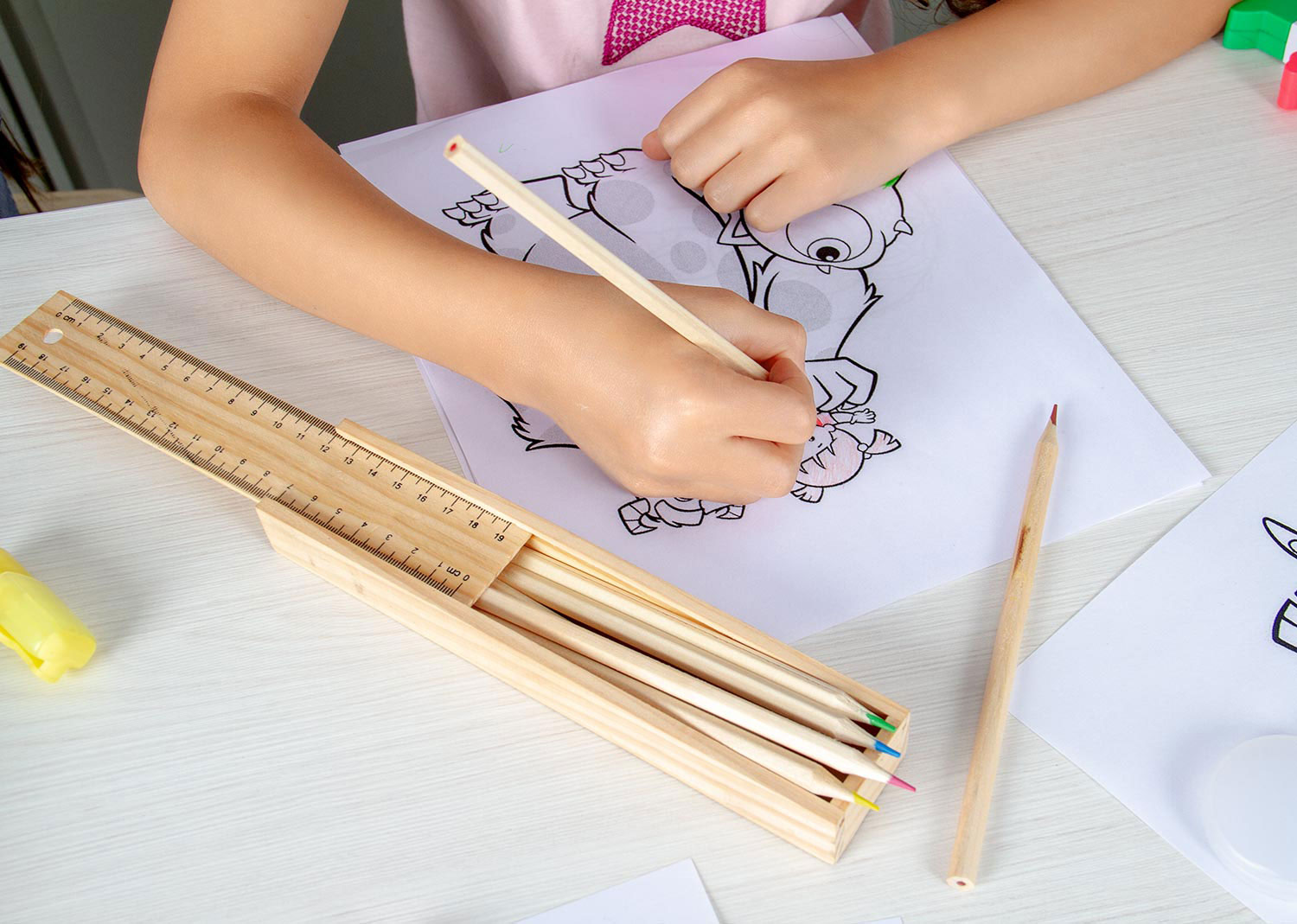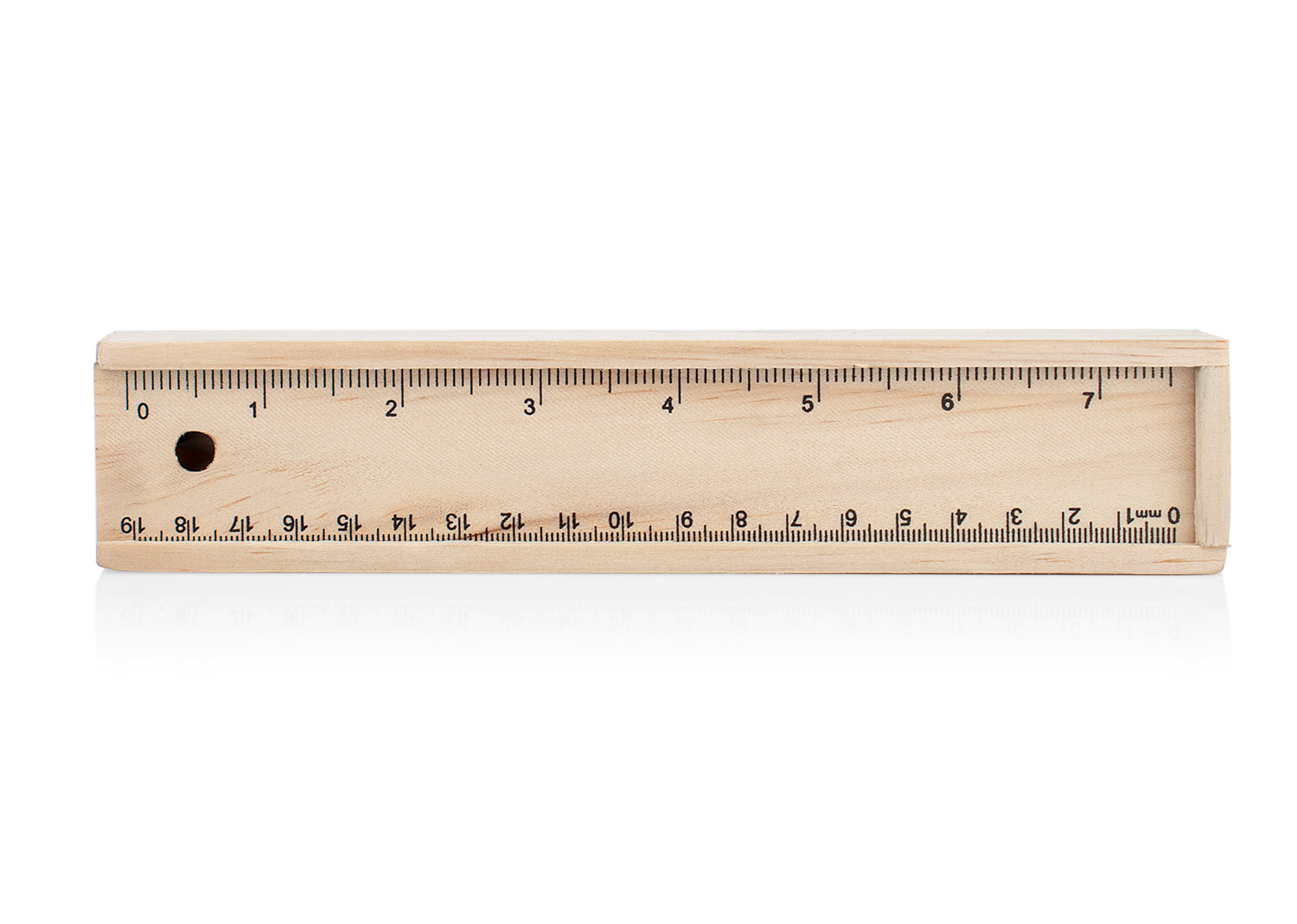 Set de 8 colores en caja de madera, la tapa es una regla de 19 cm.