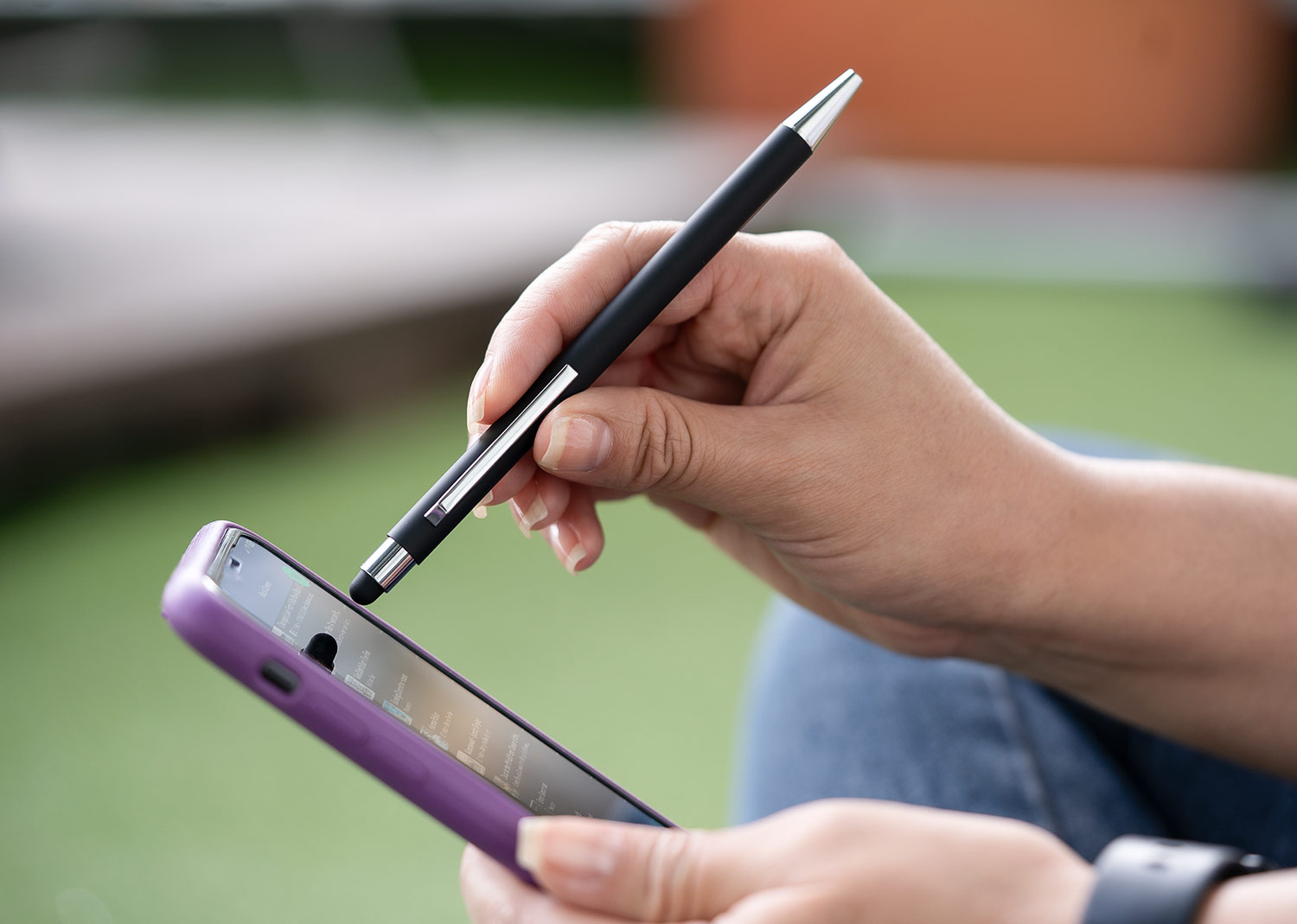 Bolígrafo retráctil con barril de aluminio engomado en color, que ofrece un agarre cómodo y elegante. Incluye clip metálico cromado y detalles en botón y punta cromados para un acabado sofisticado. Además, cuenta con función stylus en la parte superior, ideal para pantallas táctiles, combinando practicidad y estilo en un solo accesorio.