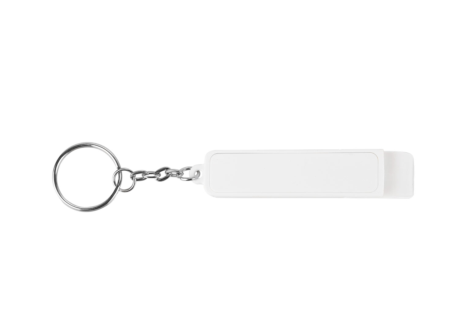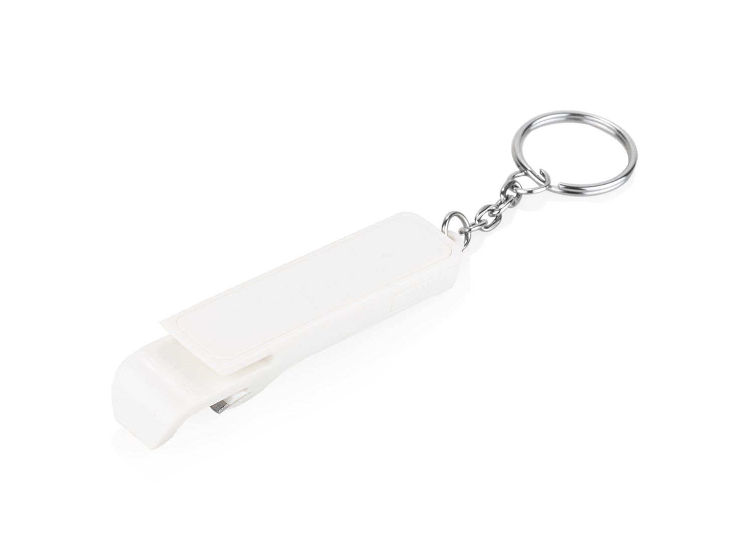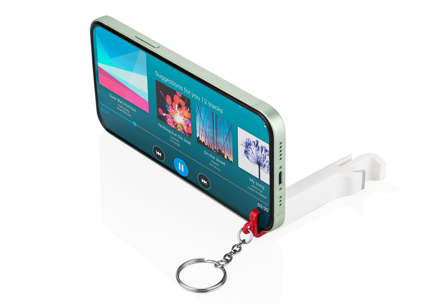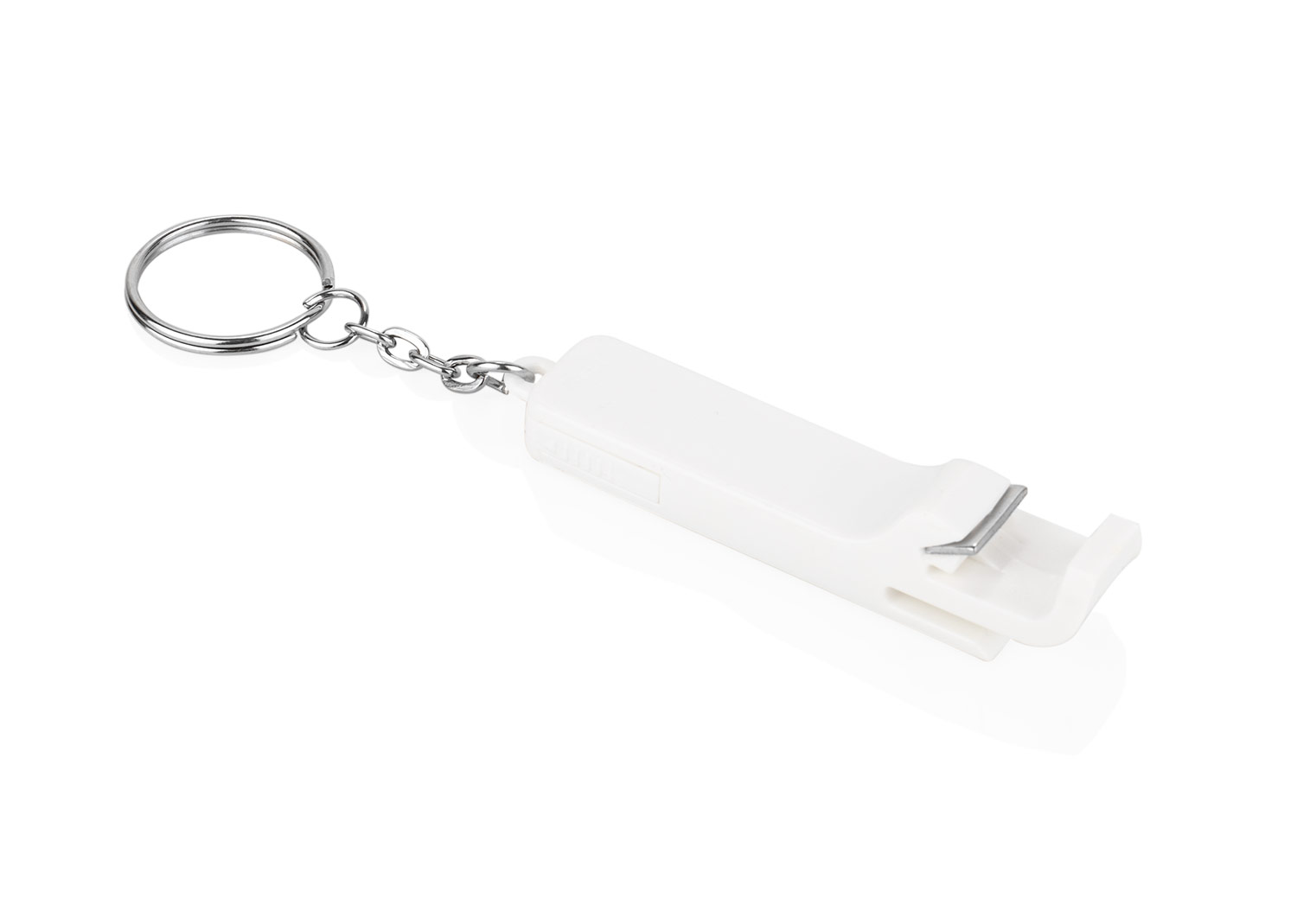 Llavero destapador fabricado en plástico durable para abrir botellas y latas de gaseosas. Con holder para el celular.