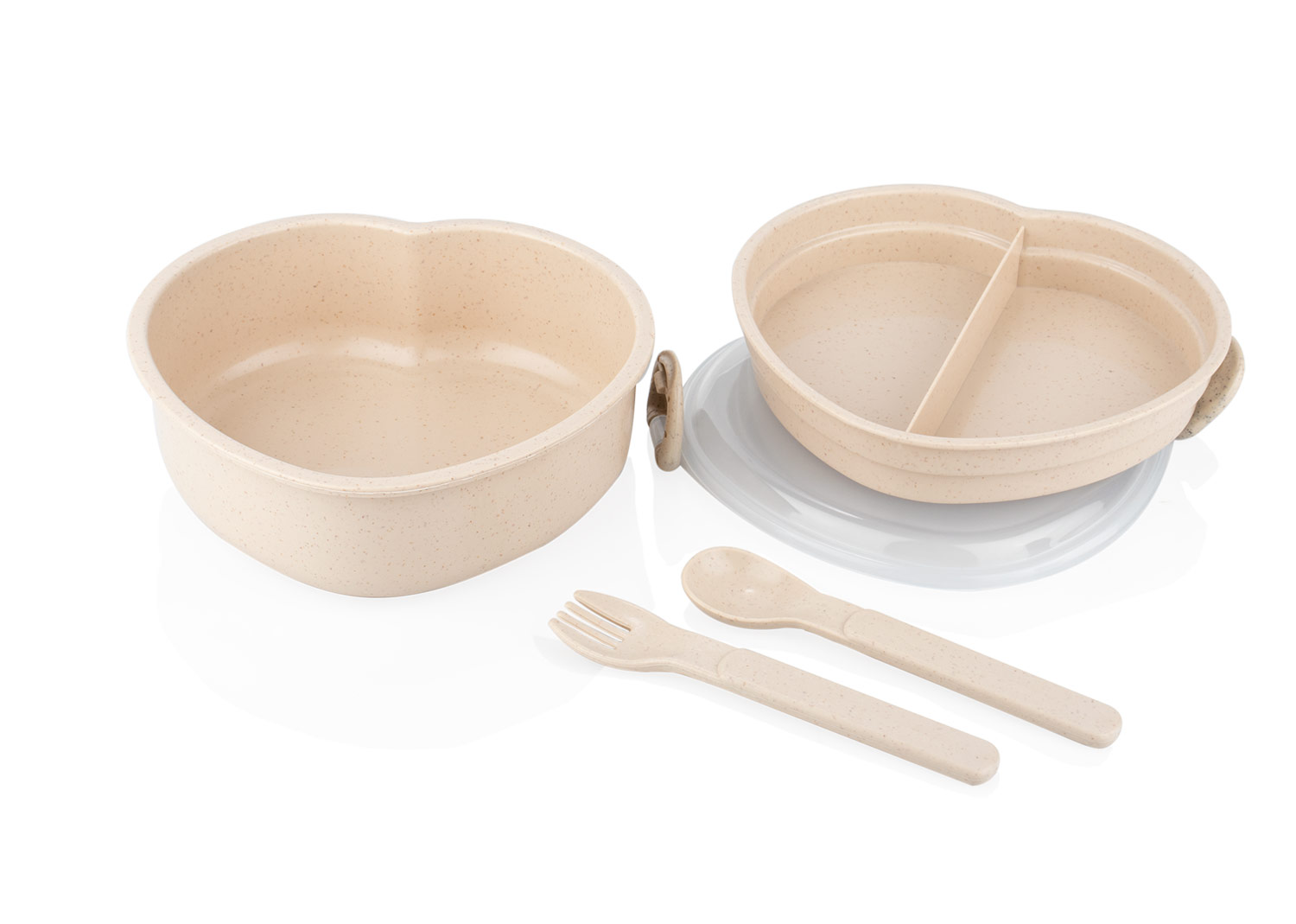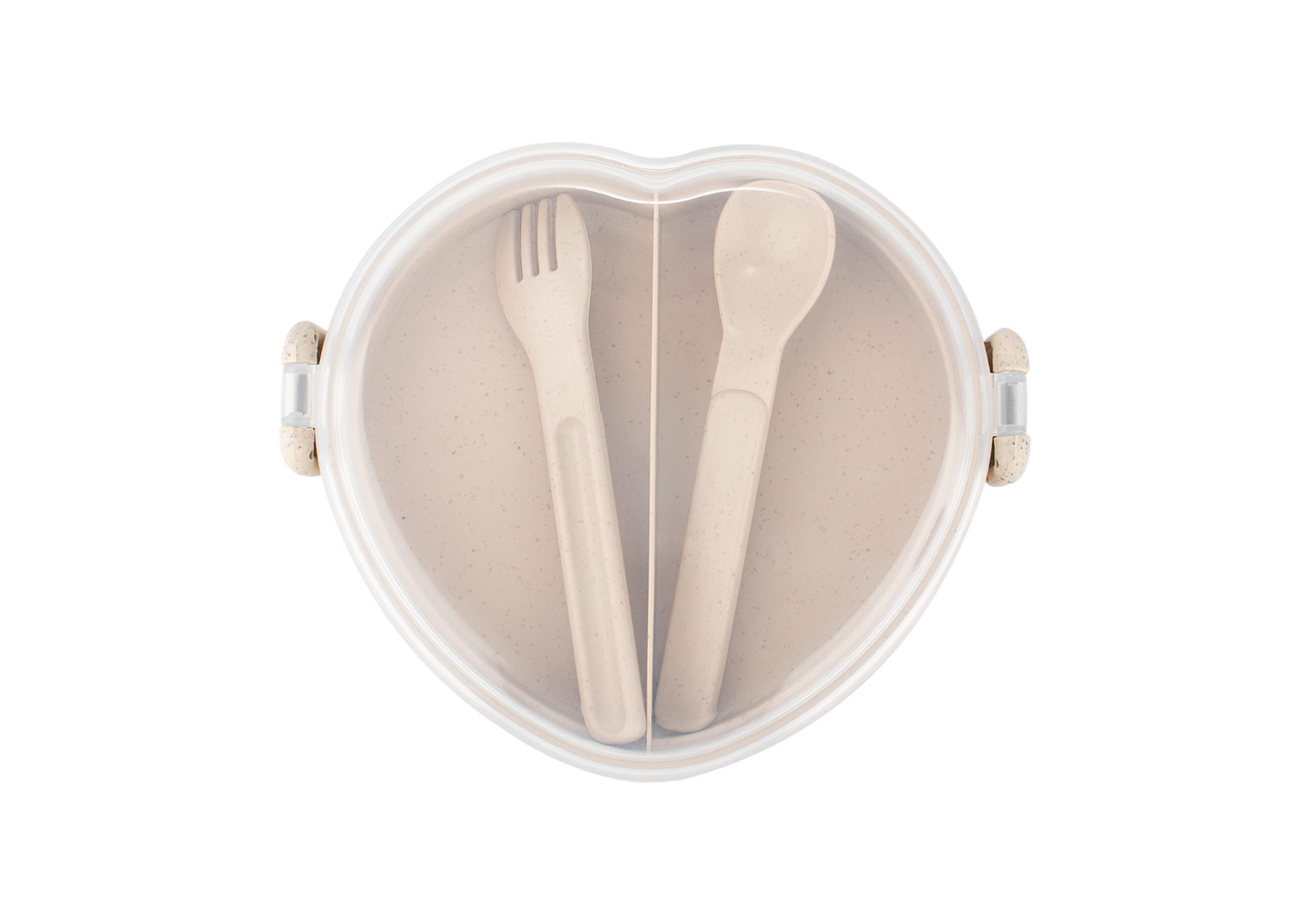 Diseño con forma de corazón, fabricada en material de paja de trigo con tapa de PP transparente. Incluye cuchara (2,7 X 12,2) y tenedor (2,3 X 12,2) del mismo material y color que la base, ubicados en un compartimiento adicional (14,2 X 13) para mayor organización. La tapa cuenta con cierres laterales que aseguran un cierre firme. Una opción ecológica y funcional para transportar tus comidas con estilo.