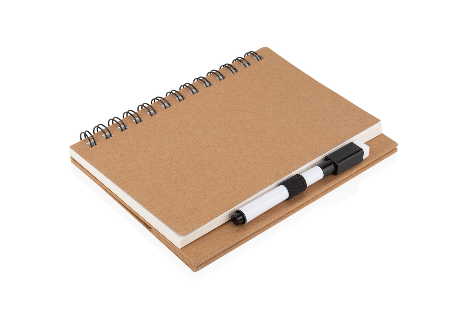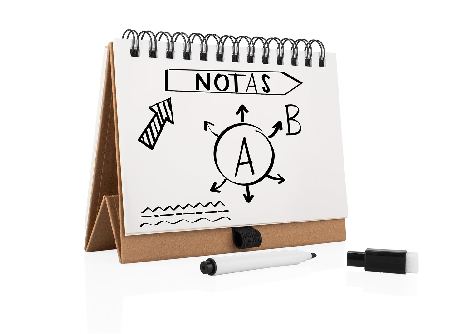 Práctica pizarra blanca con diseño tipo libreta y espiral superior, ideal para anotaciones rápidas. Incluye marcador borrable con compartimiento integrado en la base para mantenerlo siempre a mano. Su formato compacto permite colocarla en posición vertical como atril, perfecta para escritorios, oficinas o uso escolar.