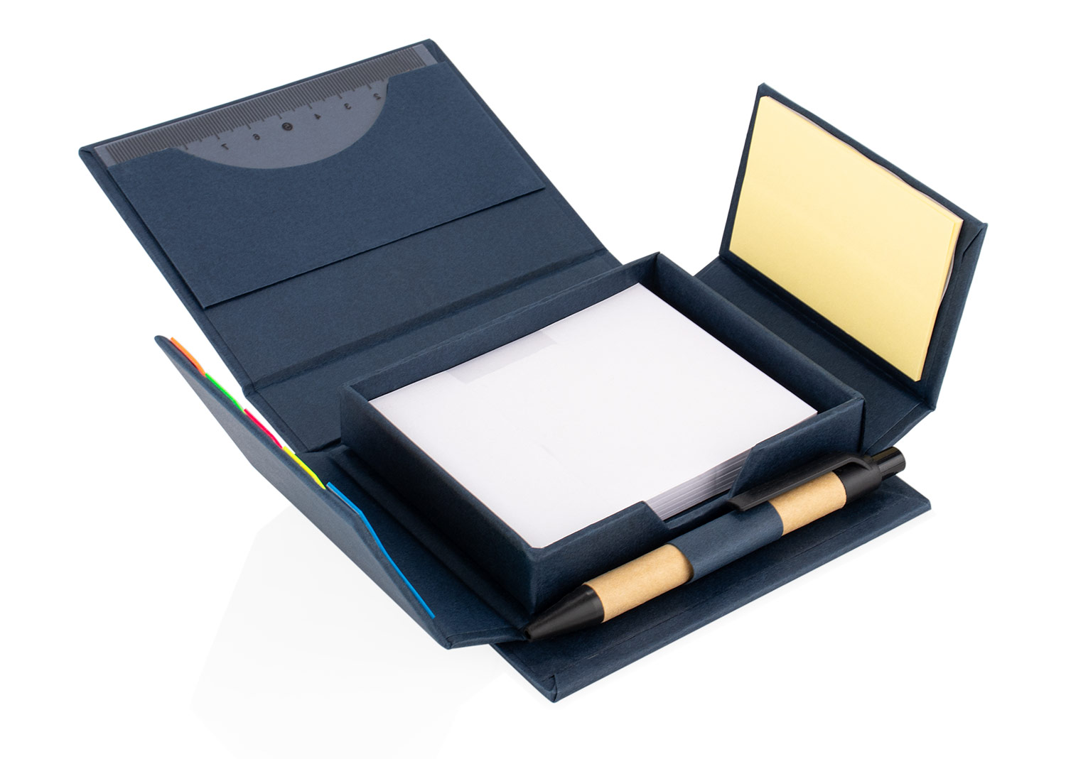 Set de escritorio presentado en elegante estuche rígido. Incluye regla de PP (10 – 4″), mini nota adhesiva (5 X 10), notas adhesivas amarillas de 15 hojas, bloc de notas blanco de 100 hojas y bolígrafo retráctil de papel. Un conjunto práctico y organizado para el día a día.