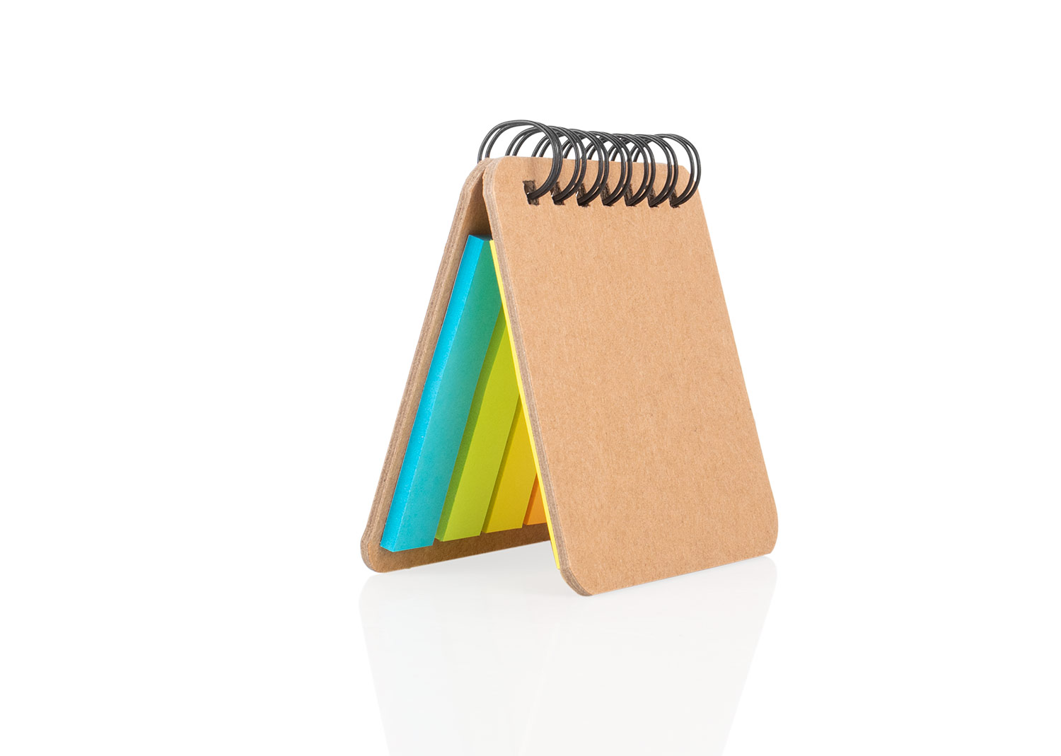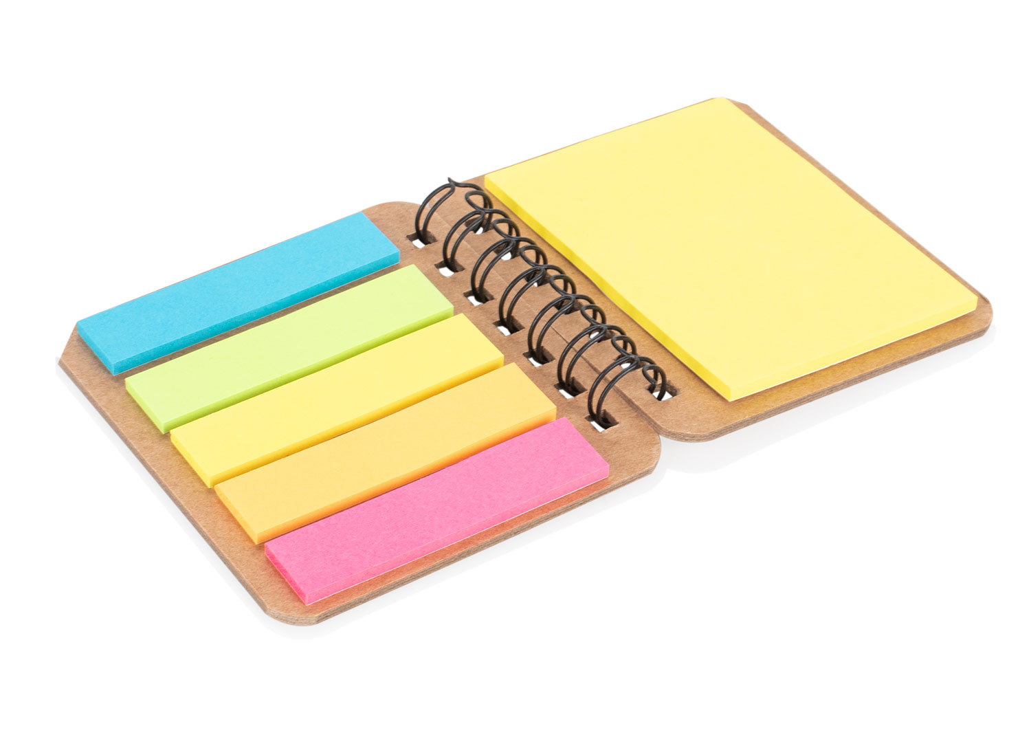 Compacta y funcional libreta con cubierta frontal y contraportada en cartón rígido. Ideal para organizar tareas y recordatorios. Incluye: 25 hojas de notas adhesivas (5,2 X 6,8) y 25 hojas de separadores adhesivos en 5 colores. Diseño en espiral que permite un fácil acceso a las notas, perfecta para uso escolar, de oficina o personal.