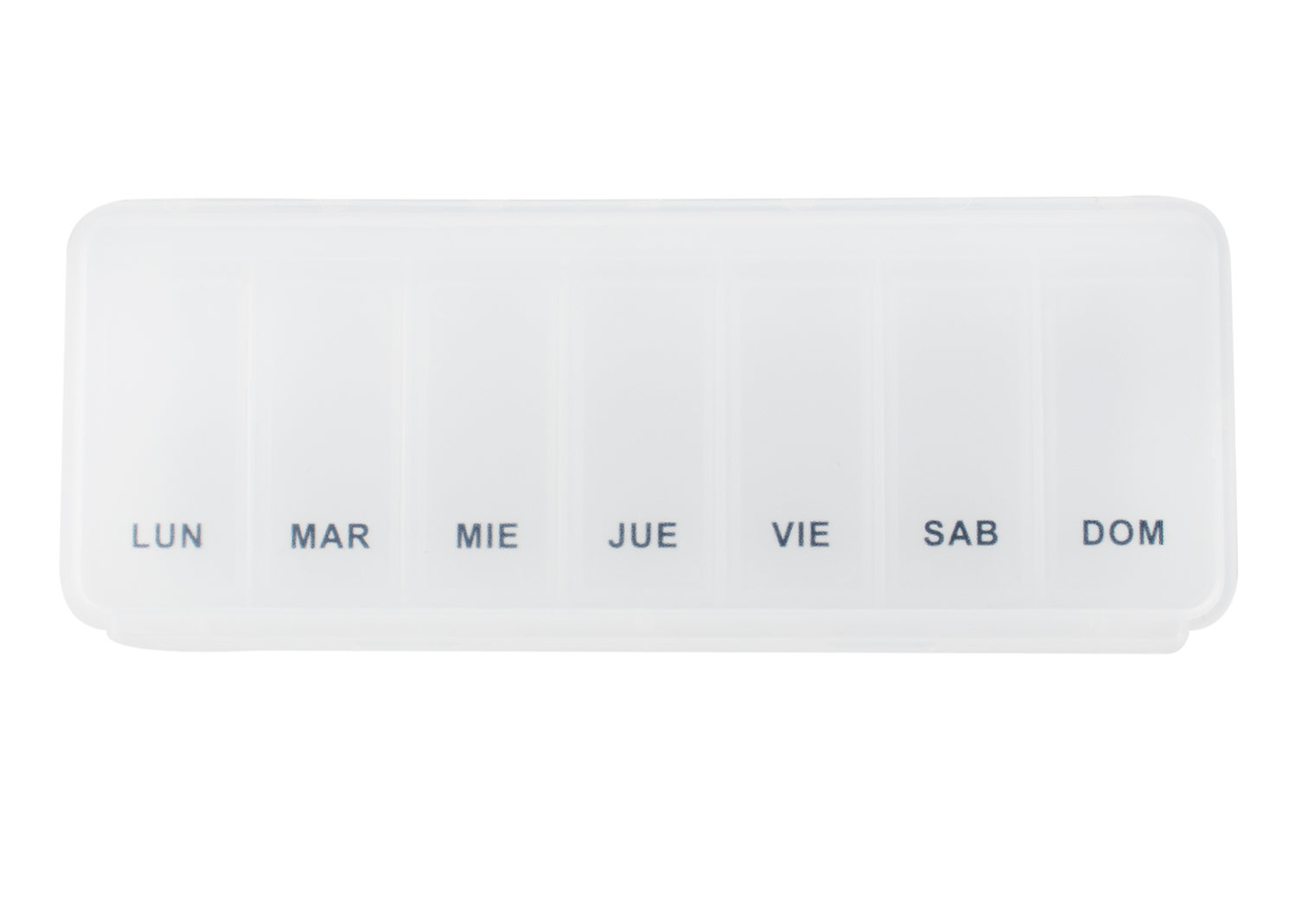 Organizador práctico para medicamentos, diseñado con 7 compartimentos individuales (6,3 X 2,1) para cada día de la semana. Fabricado en plástico transparente con tapa abatible, permite visualizar fácilmente el contenido y mantener el control diario de la dosis. Ideal para uso personal en casa o durante viajes.